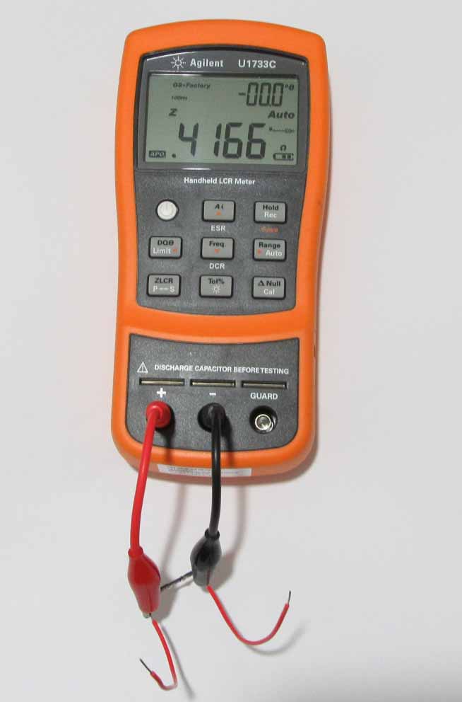 ということで、下図のように手持ちのインピーダンスメーターでこれを測定してみました。