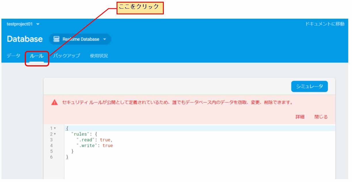 5.Realtime Database にルールを設定して、アクセス制限をかける