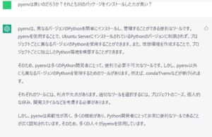 そこで、pyenvについてChat GPTに聞いてみました。こんな回答です。